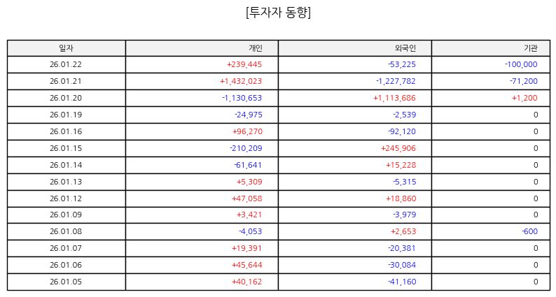 ▷ 장 초반 강한 매수세 유입으로 급등 출발했으며 거래량이 크게 증가했다. 이후 매수 우위 흐름이 지속되며 가격 제한폭까지 상승해 상한가로 마감했다. 단기 수급 집중 현상이 두드러진 하루였다.
