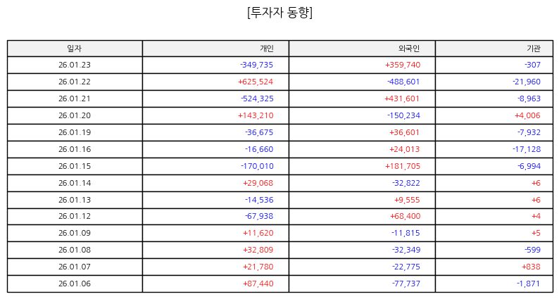 ▷ 최근 주가는 하락 추세가 이어지며 단기 이동 평균선 아래에서 움직이고 있다. 거래량 감소와 함께 하락폭이 확대된 점은 단기 매도 압력이 우세했음을 시사한다. 과거 지지선 부근에서 매수와 매도가 맞서는 흐름이 나타나고 있어 향후 방향성은 수급 변화에 따라 결정될 가능성이 크다.