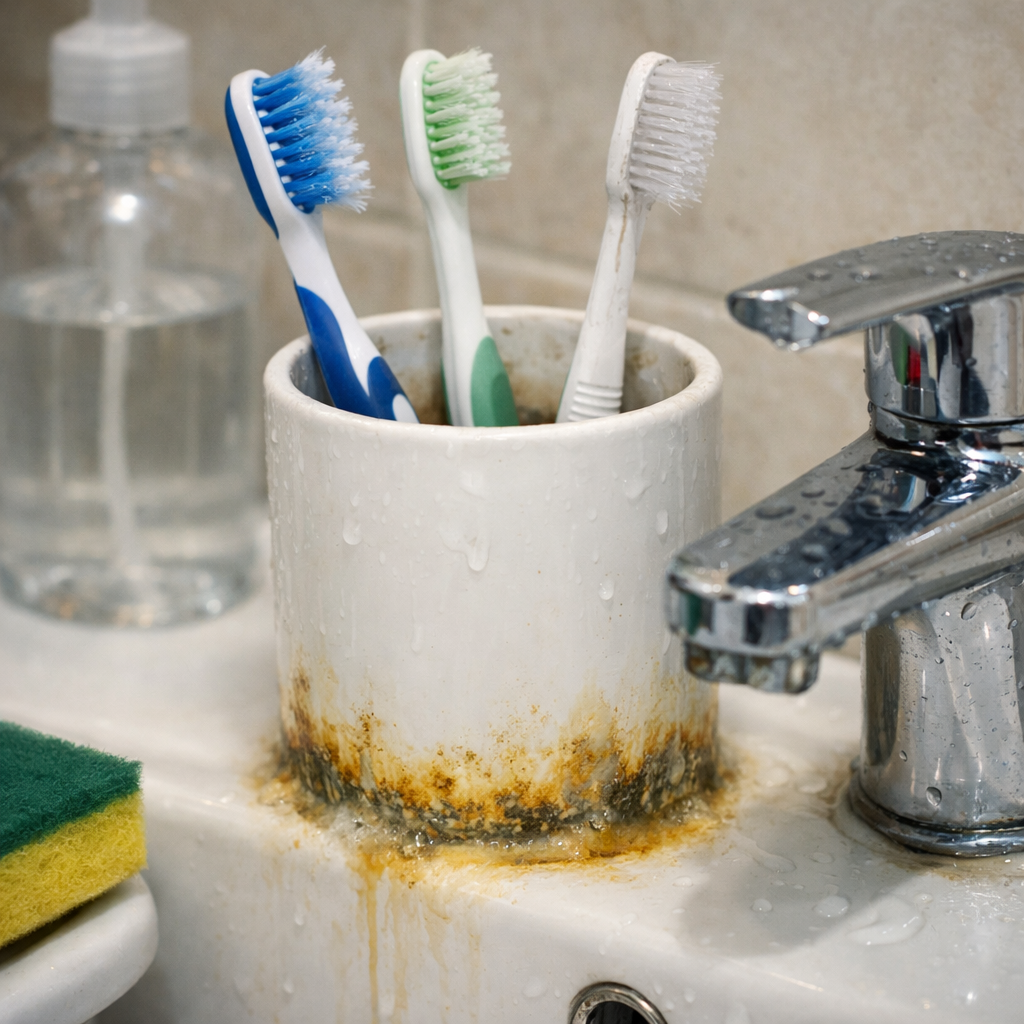 물때의 정체는 단순한 물자국이 아니다. 물때는 수돗물 속 미네랄 성분과 비누 찌꺼기 침전물 그리고 공기 중의 먼지가 결합된 형태이다. 여기에 칫솔에서 떨어지는 침과 음식물 잔여물까지 더해지면 세균 번식에 최적의 환경이 된다. 겉보기에는 투명하거나 하얗게 보이지만 시간이 지나면 미끄럽고 끈적한 막으로 변하며 악취의 원인이 되기도 한다.