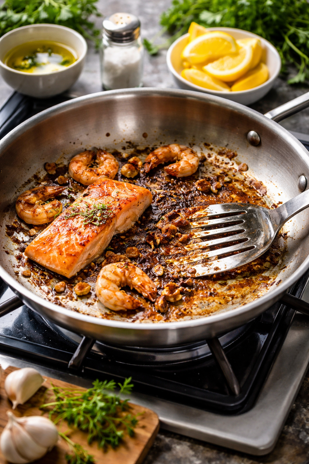 (3) 고기나 생선을 팬에 올린 직후 바로 뒤집지 말고 자연스럽게 떨어질 때까지 기다리면 표면이 익으며 분리가 쉬워진다.