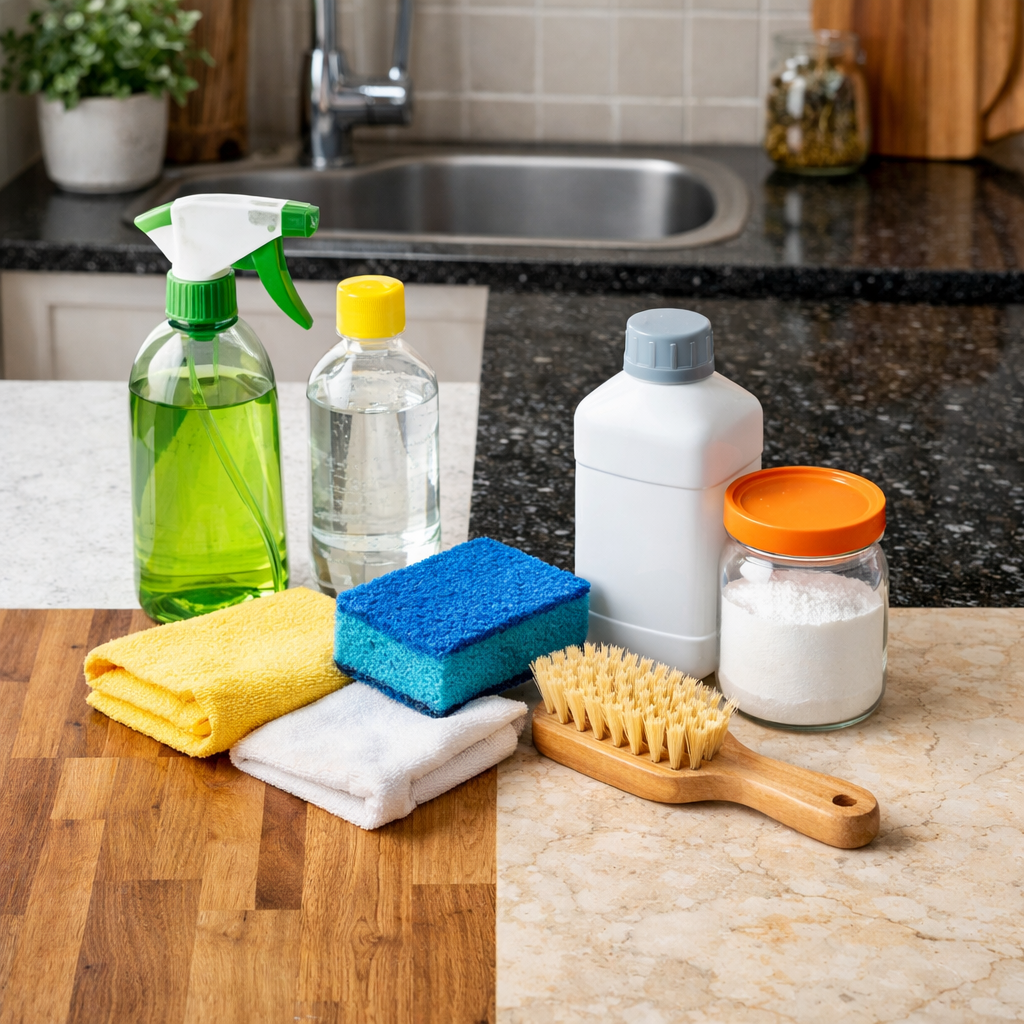 (1) 인조대리석 상판의 안전한 청소법이다. 인조대리석은 디자인이 다양하고 관리가 쉬운 편이지만 표면에 미세한 스크래치가 생기기 쉽다. 미지근한 물에 중성세제를 희석해 부드러운 스펀지로 닦는 것이 가장 안전하다. 철수세미나 연마제가 포함된 세제는 표면 광택을 손상시킬 수 있어 피해야 한다. 착색이 생겼을 경우 베이킹소다를 물에 풀어 부드럽게 문지른 뒤 바로 헹궈 주는 것이 좋다.