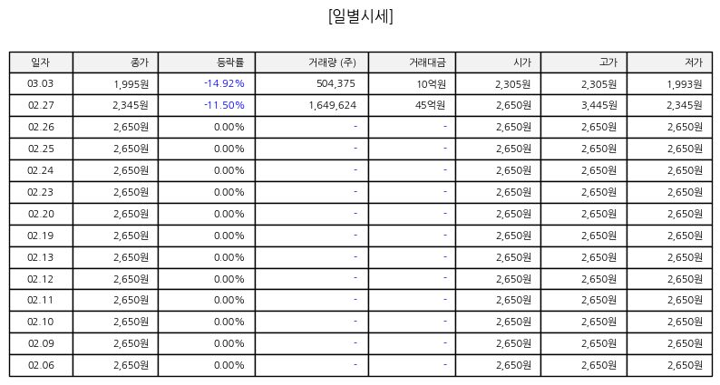 ▷ 금일 주가는 장 초반부터 매도 물량이 집중되며 하락 출발했다. 오전 중 낙폭을 일부 만회했지만 오후 들어 다시 매물이 늘어나며 약세 흐름이 강화됐다. 거래량은 전일 대비 증가해 단기 투자자들의 이탈 가능성을 시사한다. 단기 지지선 이탈 여부가 향후 방향성을 가늠하는 기준이 될 것으로 보인다.