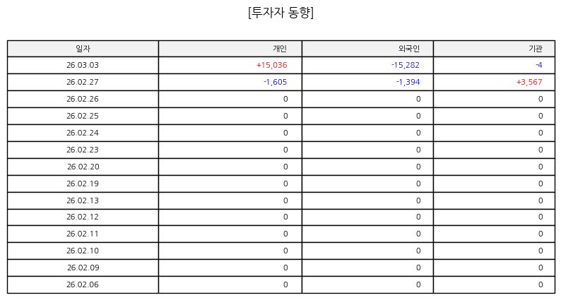 ▷ 금일 주가는 장 초반부터 매도 물량이 집중되며 하락 출발했다. 오전 중 낙폭을 일부 만회했지만 오후 들어 다시 매물이 늘어나며 약세 흐름이 강화됐다. 거래량은 전일 대비 증가해 단기 투자자들의 이탈 가능성을 시사한다. 단기 지지선 이탈 여부가 향후 방향성을 가늠하는 기준이 될 것으로 보인다.